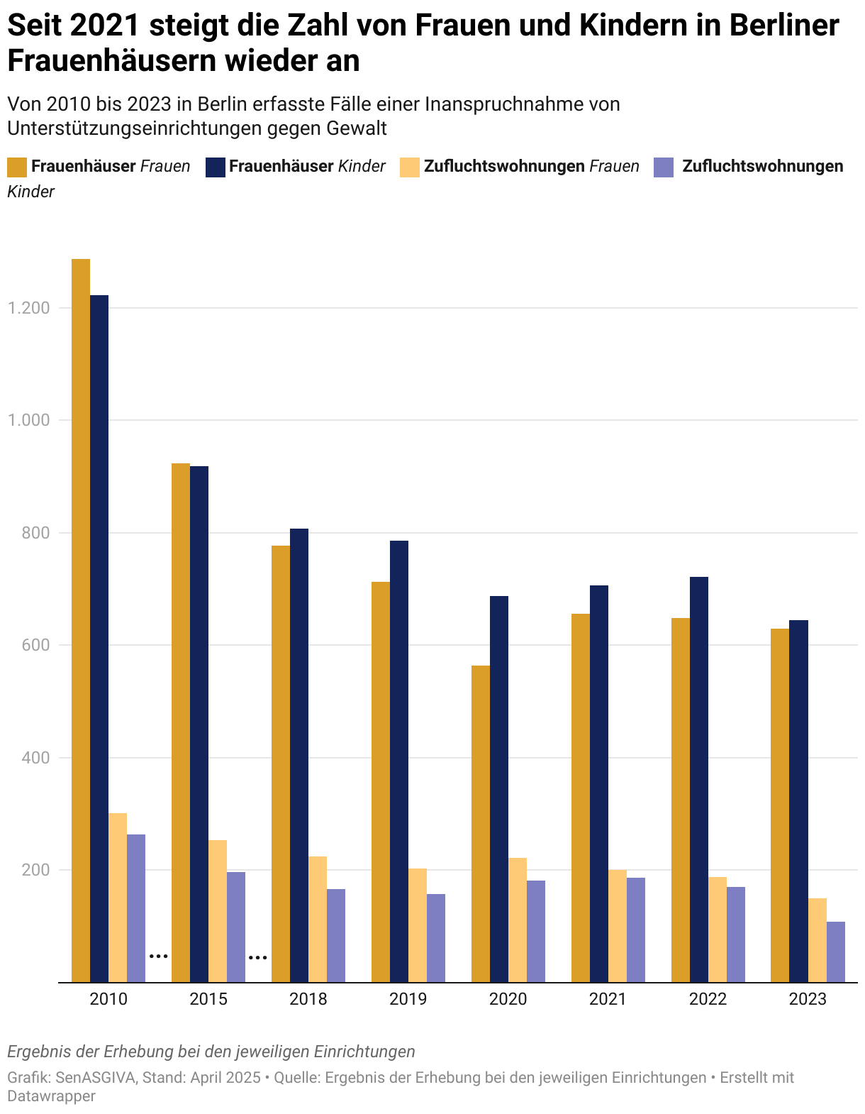 Im Jahr 2023 haben sich 630 Frauen mit insgesamt 645 Kindern in einem Frauenhaus in Sicherheit gebracht. Seit 2010 gingen die Zahlen von Jahr zu Jahr zurück – 2021 stiegen sie im Vergleich zum Vorjahr das erste Mal wieder an. Seitdem blieben die Zahlen im Vergleich zu 2021 nahezu konstant. In Zufluchtswohnungen fanden im Jahr 2023 150 Frauen mit 108 Kindern Schutz.
