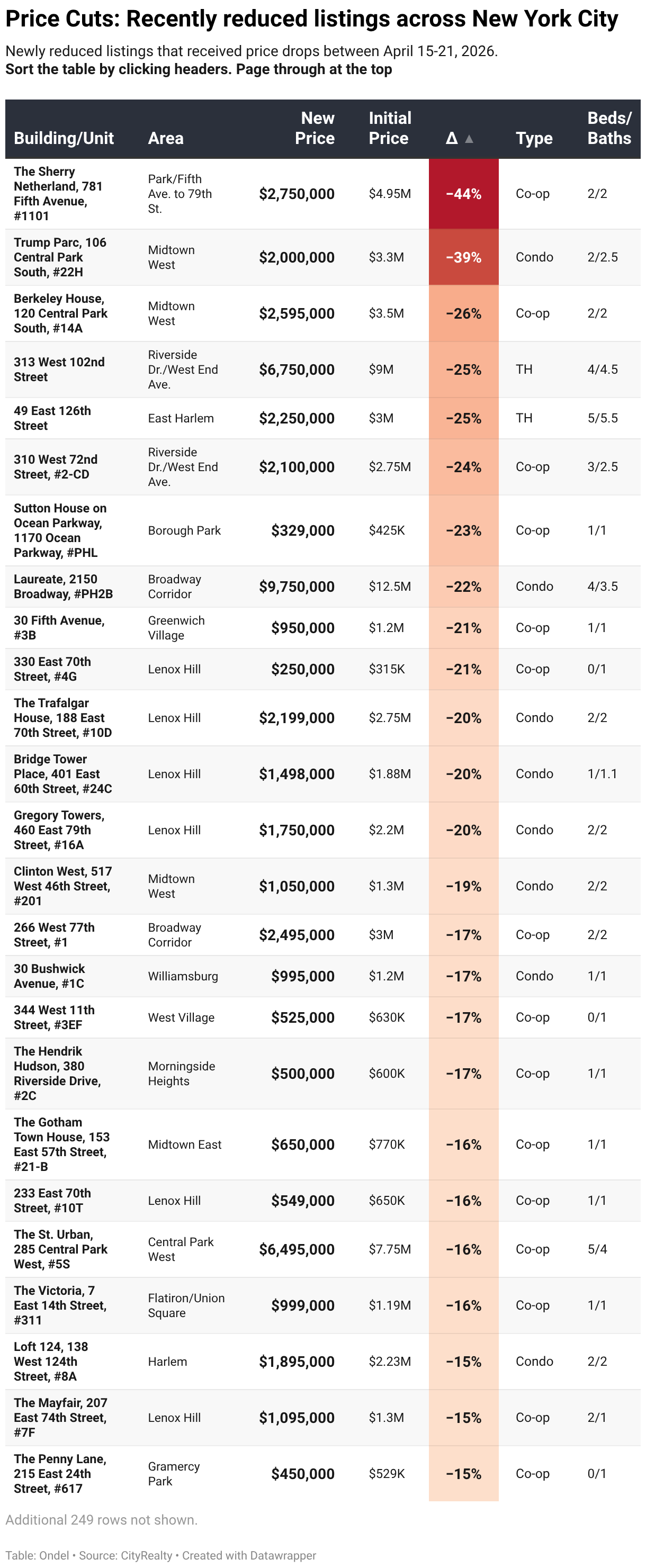 Newly reduced listings that received price drops between April 15-21, 2026. Sort the table by clicking headers. Page through at the top