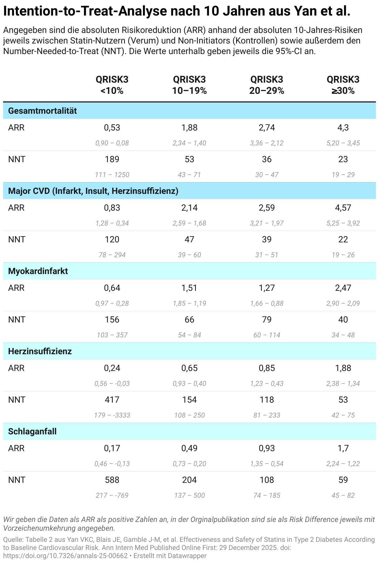 Angegeben sind die absoluten Risikoreduktion (ARR) anhand der absoluten 10-Jahres-Risiken jeweils zwischen Statin-Nutzern (Verum) und Non-Initiators (Kontrollen) sowie außerdem den Number-Needed-to-Treat (NNT). Die Werte unterhalb geben jeweils die 95%-CI an.