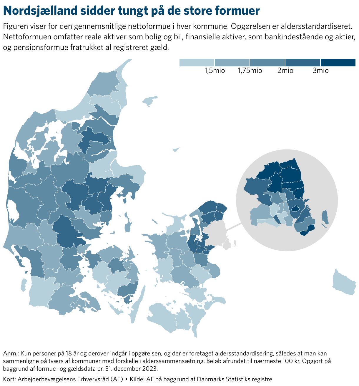 Figuren viser for den gennemsnitlige nettoformue i hver kommune. Opgørelsen er aldersstandardiseret. Nettoformuen omfatter reale aktiver som bolig og bil, finansielle aktiver, som bankindestående og aktier, og pensionsformue fratrukket al registreret gæld.