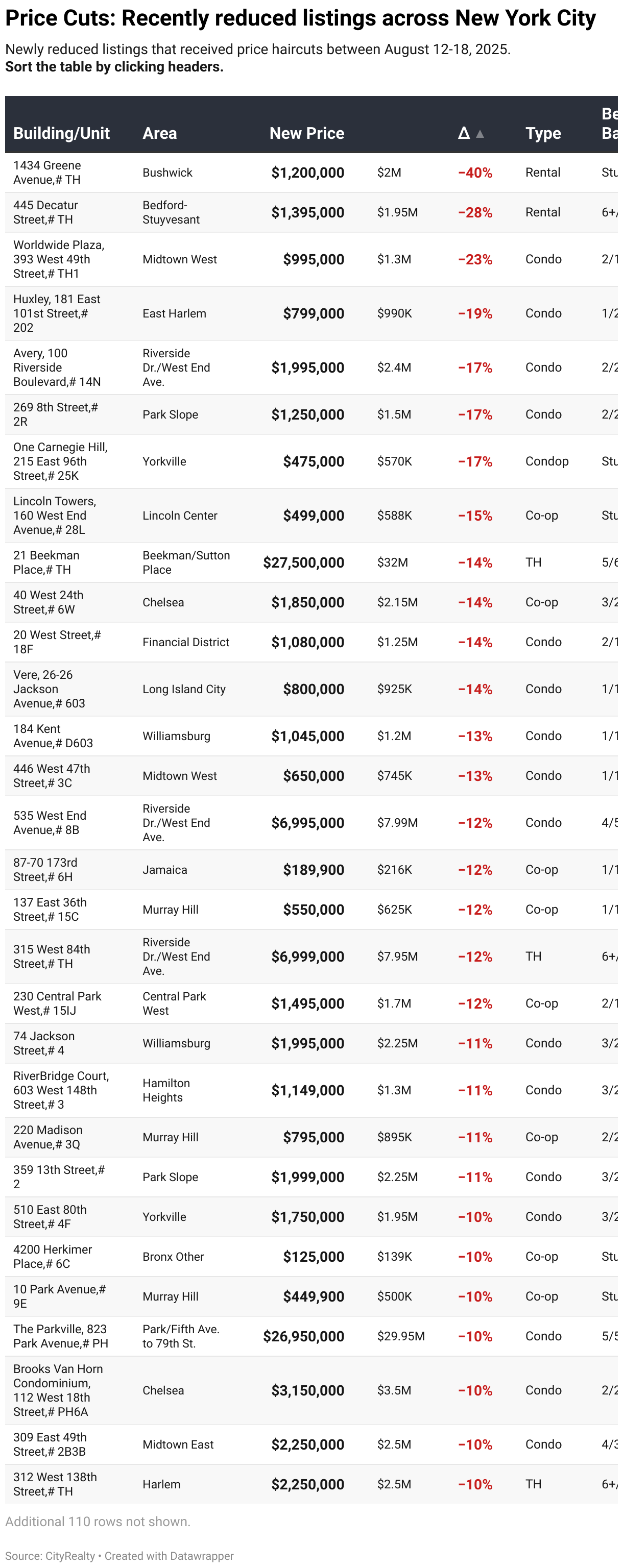 Newly reduced listings that received price haircuts between August 12-18, 2025. Sort the table by clicking headers.