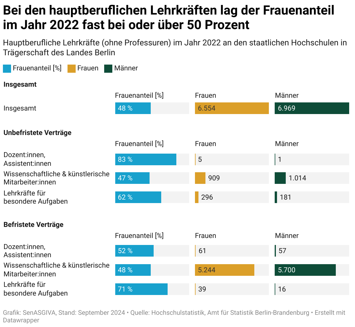 Die Gruppe der wissenschaftlichen und künstlerischen Mitarbeitenden ist mit fast 13.000 Beschäftigten die größte Gruppe – 85 Prozent dieser Verträge sind jedoch befristet. Der Frauenanteil liegt hier bei jeweils knapp unter 50 Prozent.