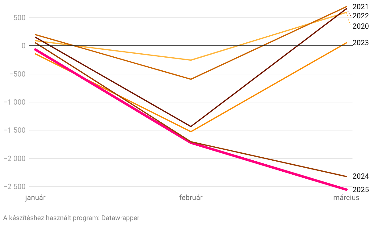 Az államháztartási hiány alakulása az év első három hónap végéig (milliárd forint)