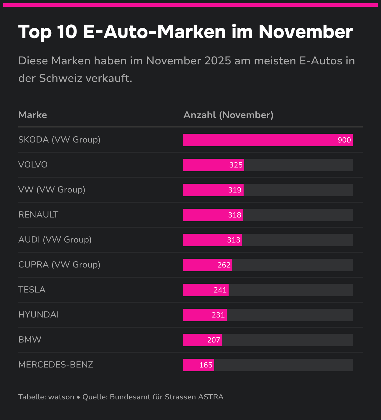 Diese Marken haben im November 2025 am meisten E-Autos in der Schweiz verkauft.