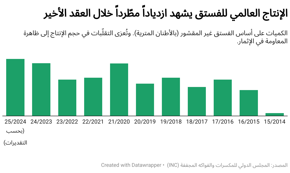 الكميات على أساس الفستق غير المقشور (بالأطنان المترية). وتُعزى التقلّبات في حجم الإنتاج إلى ظاهرة المعاومة في الإثمار.