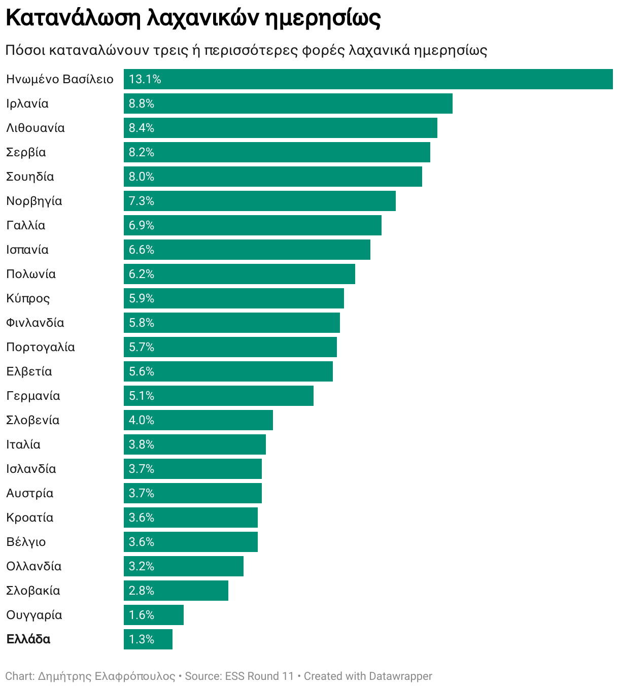 Πόσοι καταναλώνουν τρεις ή περισσότερες φορές λαχανικά ημερησίως