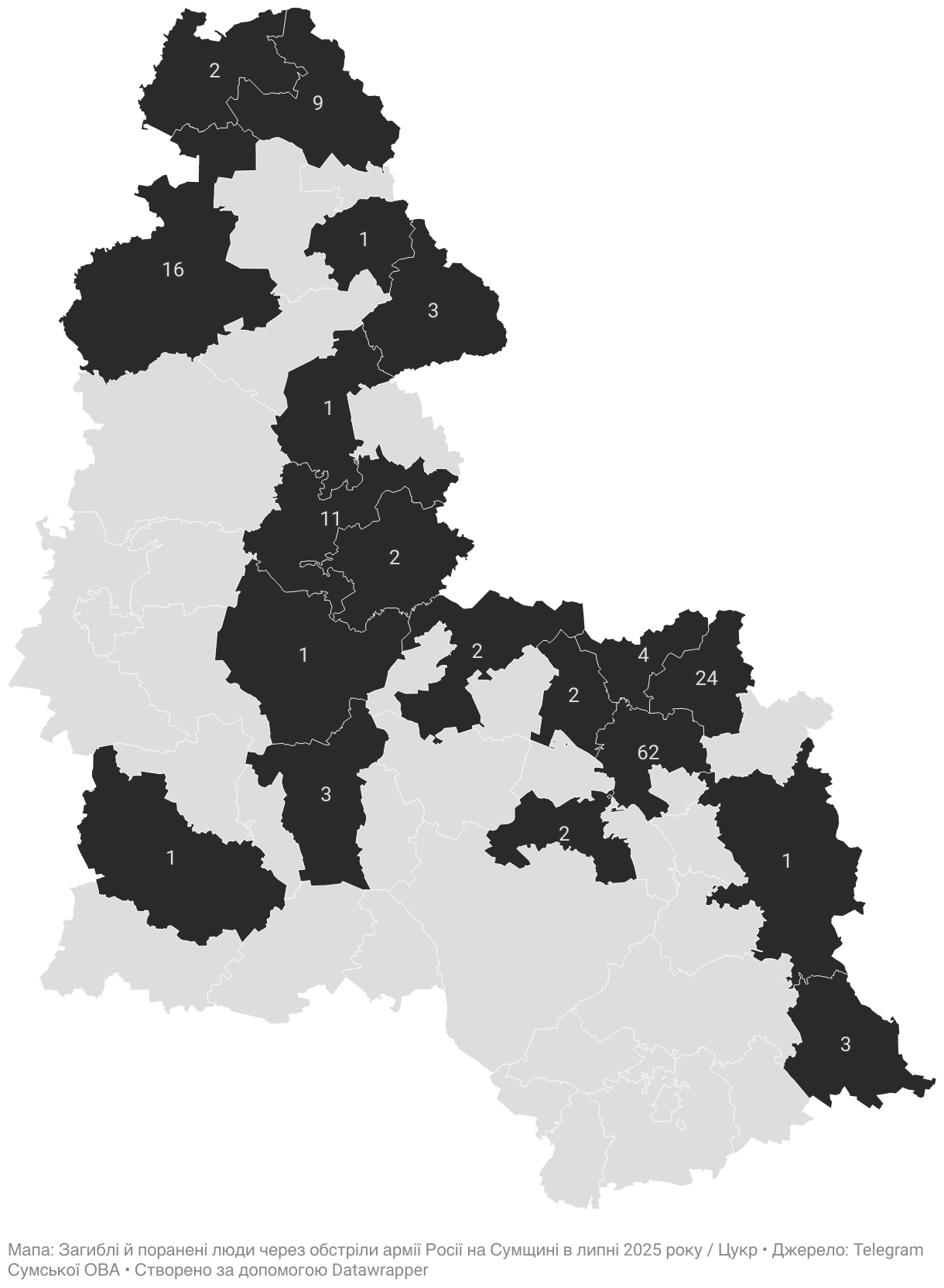 Діаграма: Загиблі й поранені люди через обстріли армії Росії на Сумщині в липні 2025 року / ЦукрДжерело: Telegram Сумської ОВАЗавантажити зображенняСтворено за допомогою Datawrapper