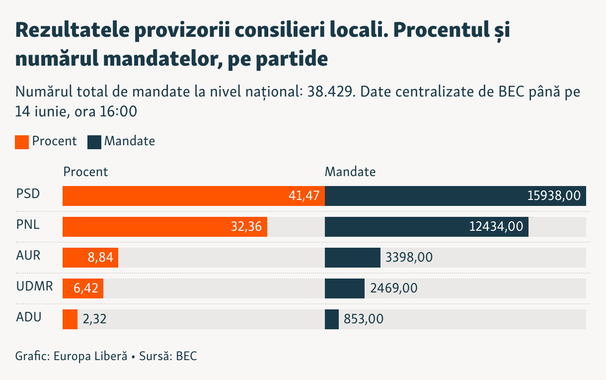 Numărul total de mandate la nivel național: 38.429. Date centralizate de BEC până pe 14 iunie, ora 16:00