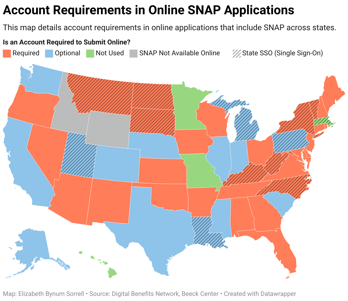 This image shows a map of the continental United States, as well as Alaska and Hawaii, and depicts which states use required or optional account creation, and which states do not use accounts, for their online SNAP applications.