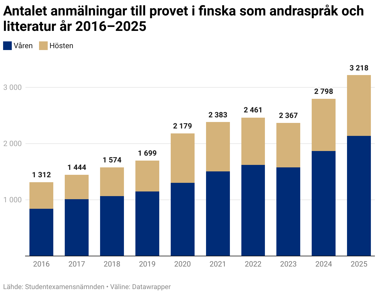 Antalet anmälningar till provet i finska som andraspråk och litteratur år 2016–2025