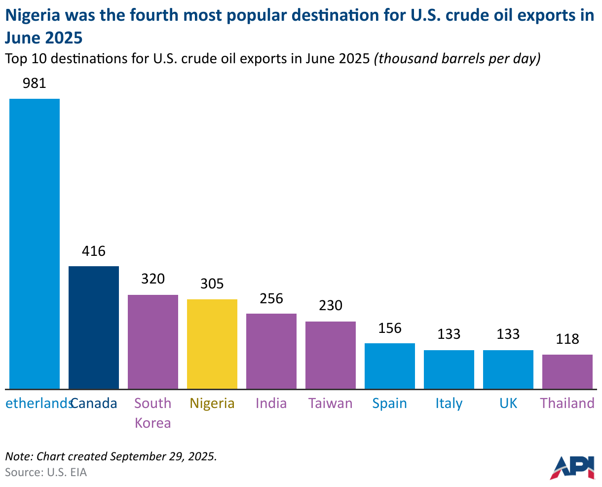 Top 10 destinations for U.S. crude oil exports in June 2025 (thousand barrels per day)
