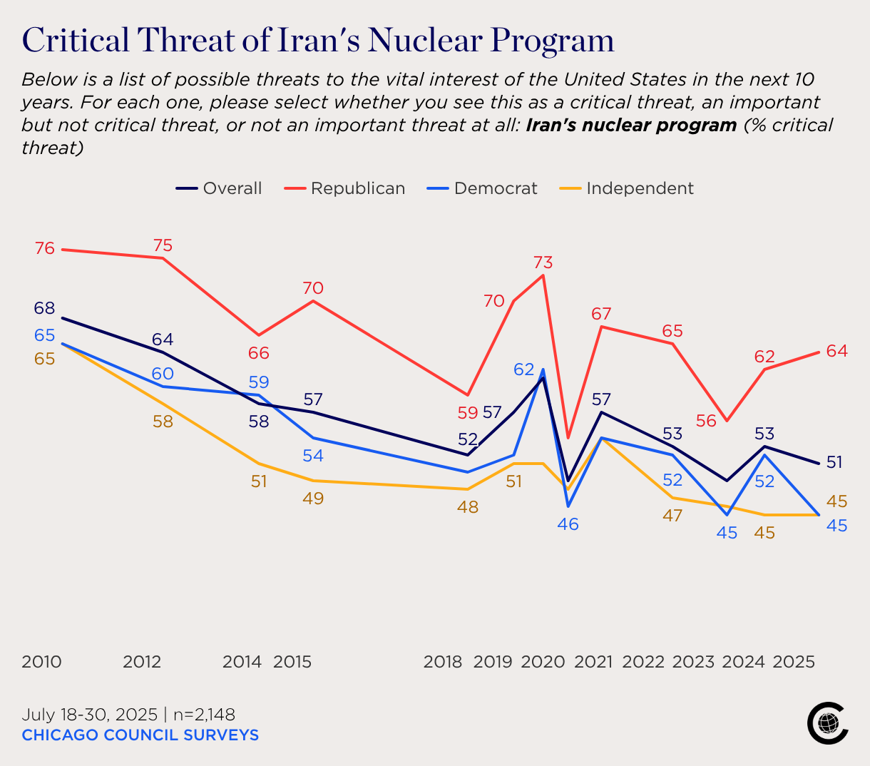 Below is a list of possible threats to the vital interest of the United States in the next 10 years. For each one, please select whether you see this as a critical threat, an important but not critical threat, or not an important threat at all: Iran's nuclear program (% critical threat)