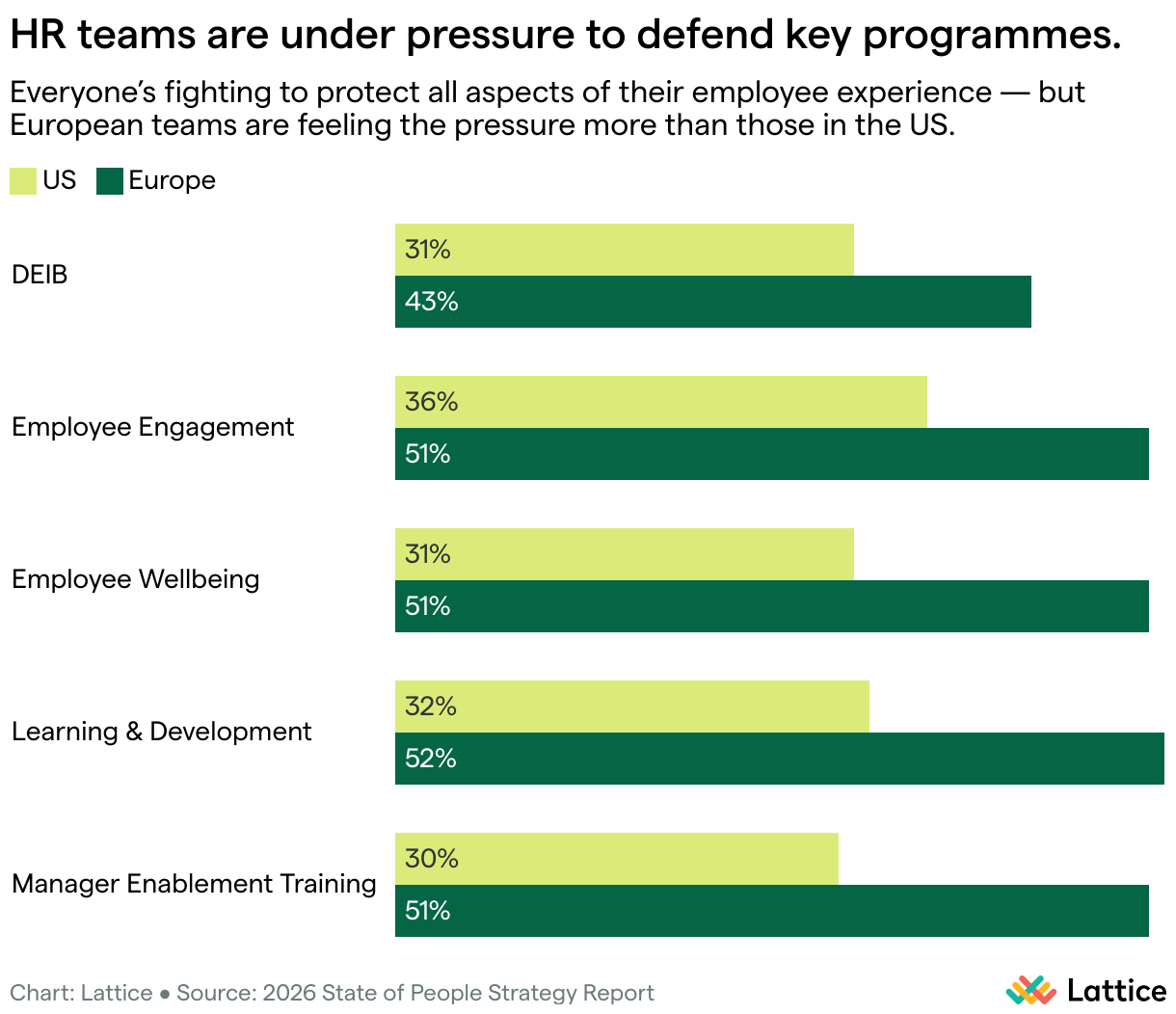 Bar chart titled “HR teams are under pressure to defend key programmes.” DEIB: US 31%, Europe 43%. Employee engagement: US 36%, Europe 51%. Employee wellbeing: US 31%, Europe 51%. Learning & development: US 32%, Europe 52%. Manager enablement training: US 30%, Europe 51%. Key insight: HR in Europe feels significantly more pressure than US teams to defend programs across engagement, wellbeing, and development.