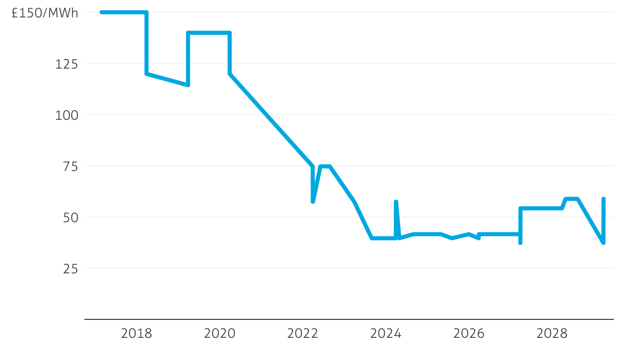 Agreed UK offshore wind strike prices, delivery years 2017–29