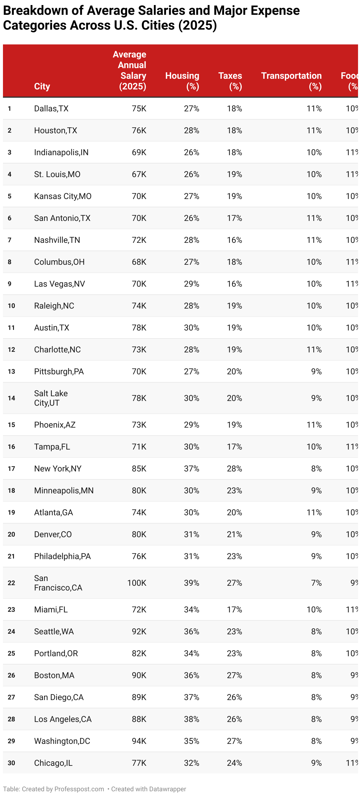 Breakdown of Average Salaries and Major Expense Categories Across U.S. Cities (2025)