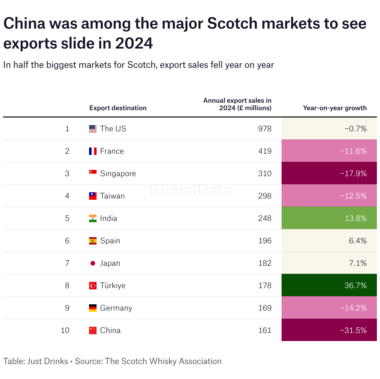 In half the biggest markets for Scotch, export sales fell year on year