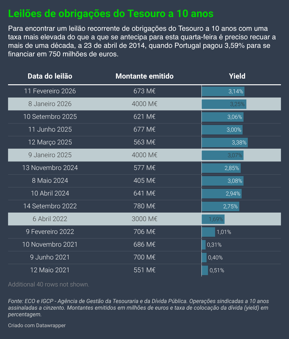 Para encontrar um leilão recorrente de obrigações do Tesouro a 10 anos com uma taxa mais elevada do que a que se antecipa para esta quarta-feira é preciso recuar a mais de uma década, a 23 de abril de 2014, quando Portugal pagou 3,59% para se financiar em 750 milhões de euros.