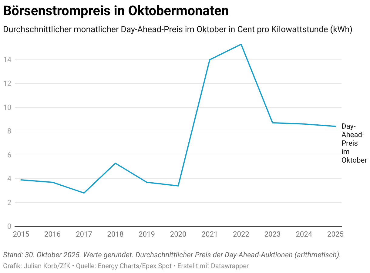 Durchschnittlicher monatlicher Day-Ahead-Preis im Oktober in Cent pro Kilowattstunde (kWh)