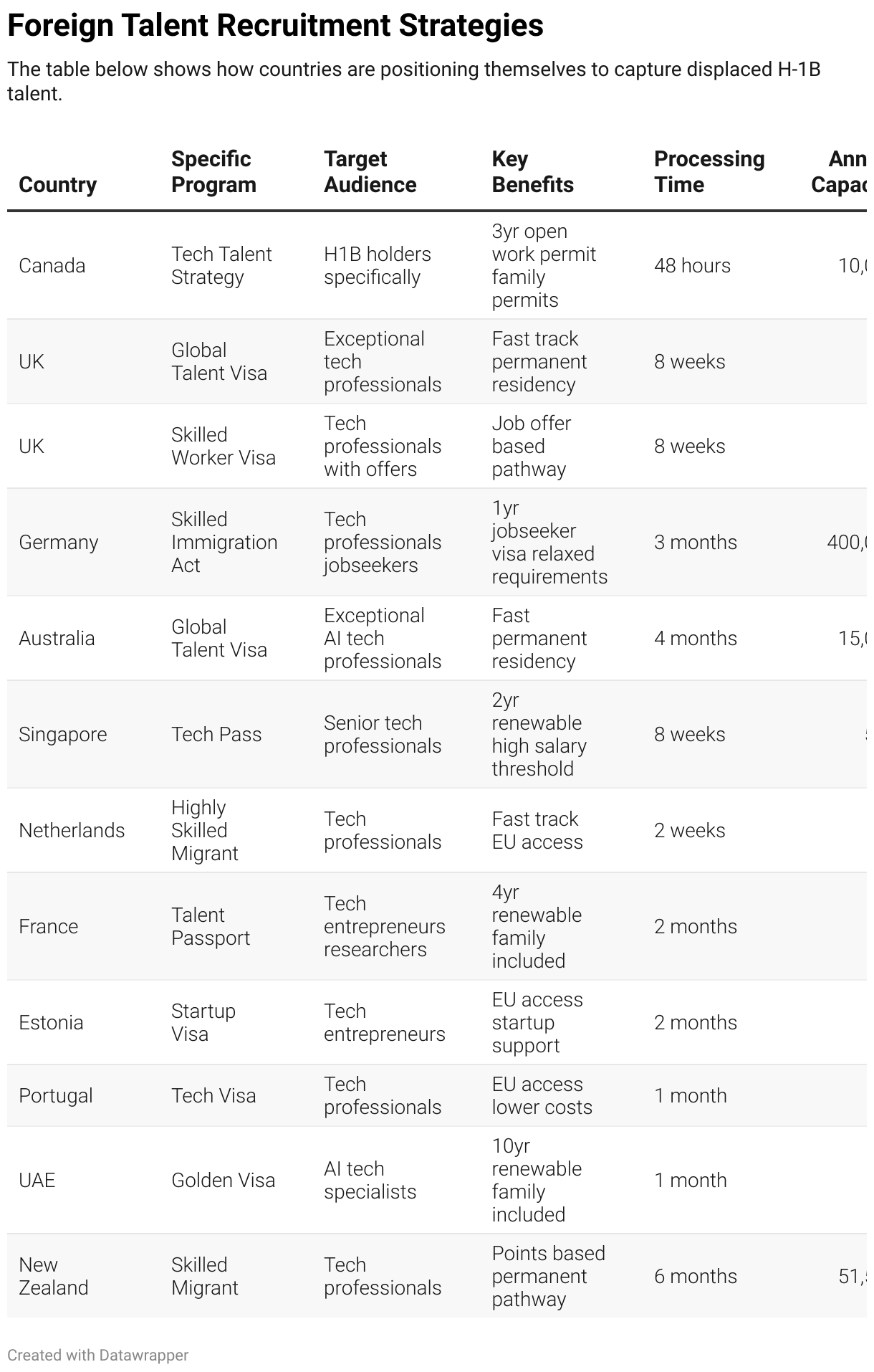 The table below shows how countries are positioning themselves to capture displaced H-1B talent.