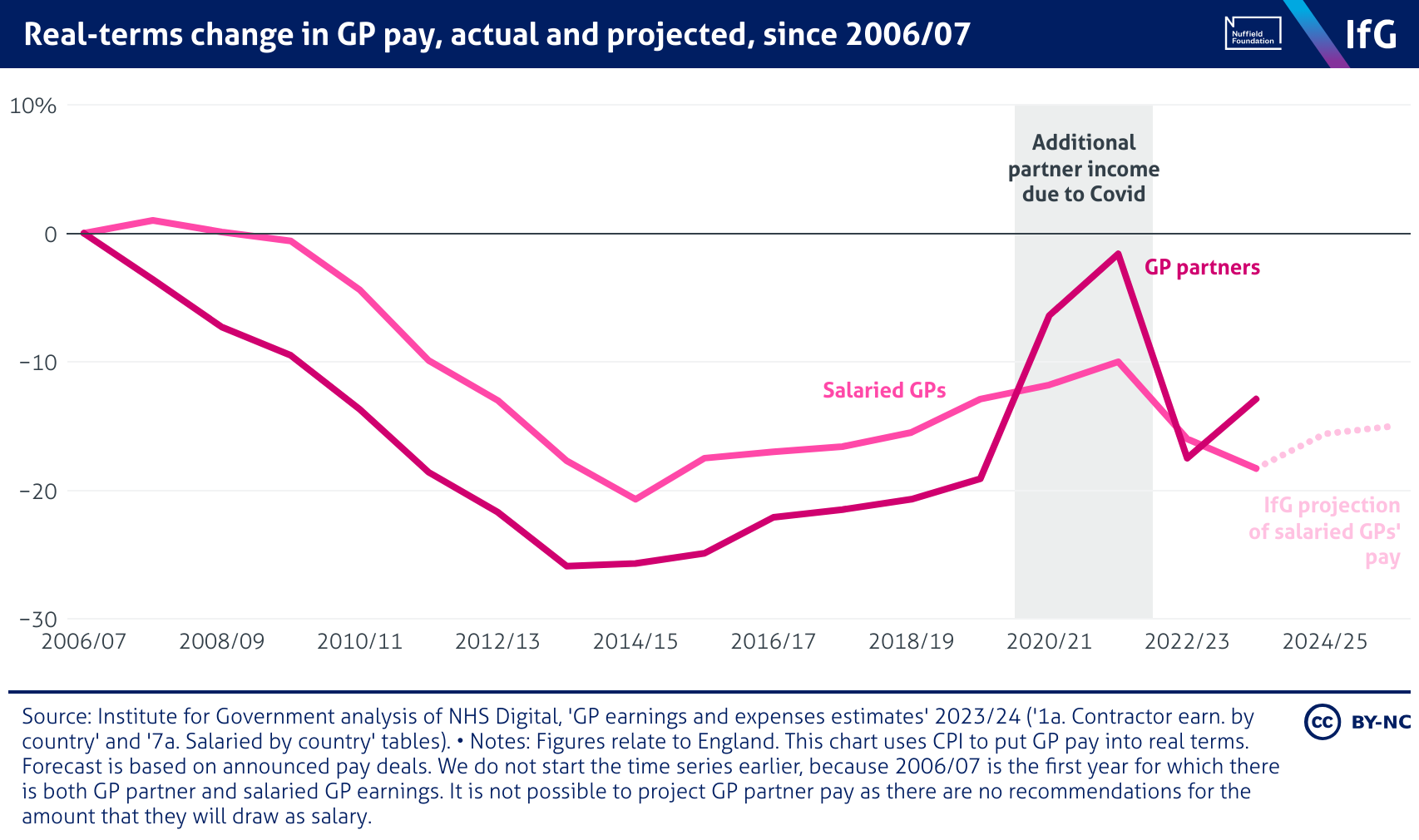 A line chart from the Institute for Government of the change in GP pay, actual and forecast, since 2006/07 (real terms) where pay falls for both salaried GPs and GP partners since 2006/07. Pay then rose gradually, with GP partners experiencing a temporary boost during Covid before falling again in 2022. Salaried GP pay is projected to remain around 15% below 2006/07 levels by 2025/26.
