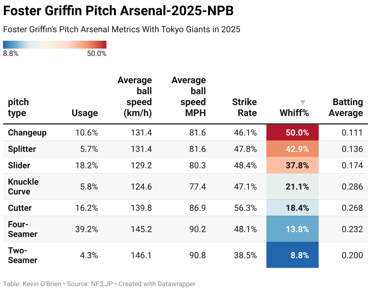 Foster Griffin's Pitch Arsenal Metrics With Tokyo Giants in 2025