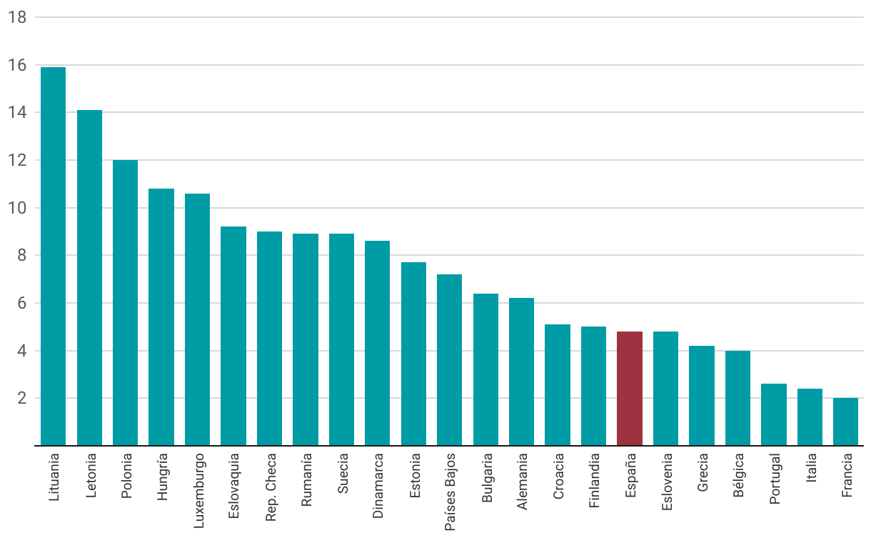 Gráfico de columnas que muestra la tasa anual compuesta de incremento del gasto público en defensa de los países miembros de la OTAN entre 2014 y 2024.