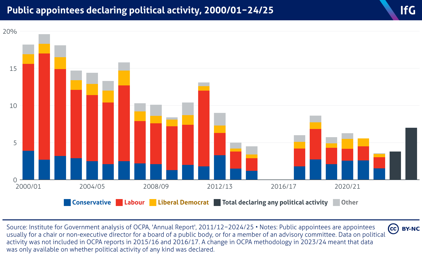 A stacked column chart form the Institute for Government showing the proportion of public appointees declaring political activity from 2000/01 to 2023/24. The proportion has decreased over time, with Labour being the best-represented political party.
