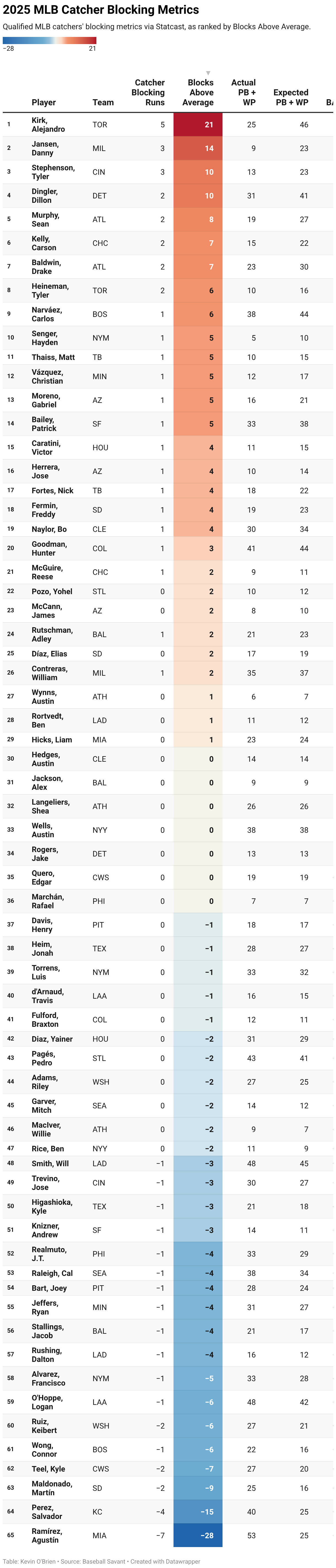 Qualified MLB catchers' blocking metrics via Statcast, as ranked by Blocks Above Average.