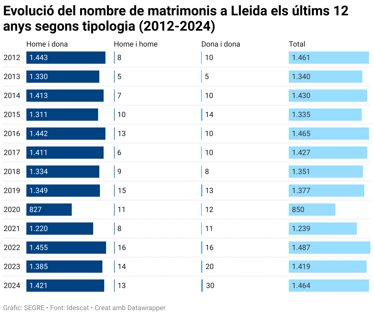 Evolució del nombre de matrimonis a Lleida els últims 12 anys segons tipologia (2012-2024)