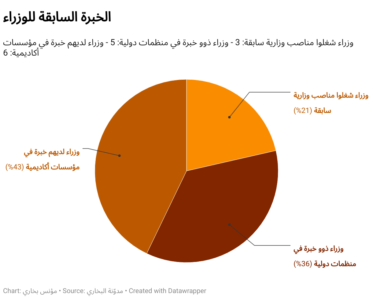 وزراء شغلوا مناصب وزارية سابقة: 3 - وزراء ذوو خبرة في منظمات دولية: 5 - وزراء لديهم خبرة في مؤسسات أكاديمية: 6
