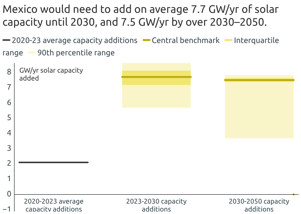 Mexico would need to add on average 7.7 GW/yr of solar capacity until 2030, and 7.5 GW/yr by over 2030–2050.
