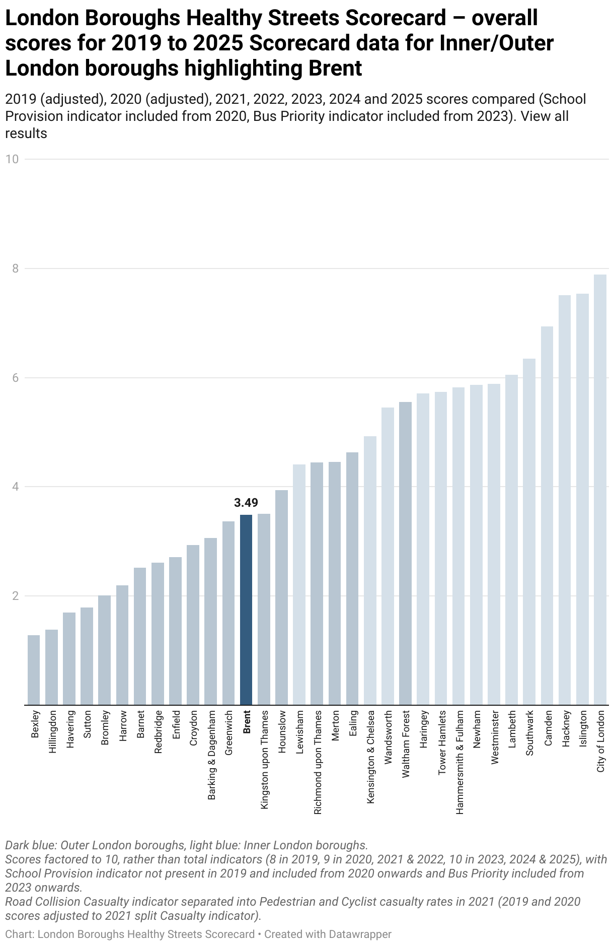London Boroughs Healthy Streets Scorecard – overall scores for 2019 to 2025 Scorecard data for Inner/Outer London boroughs highlighting Brent
