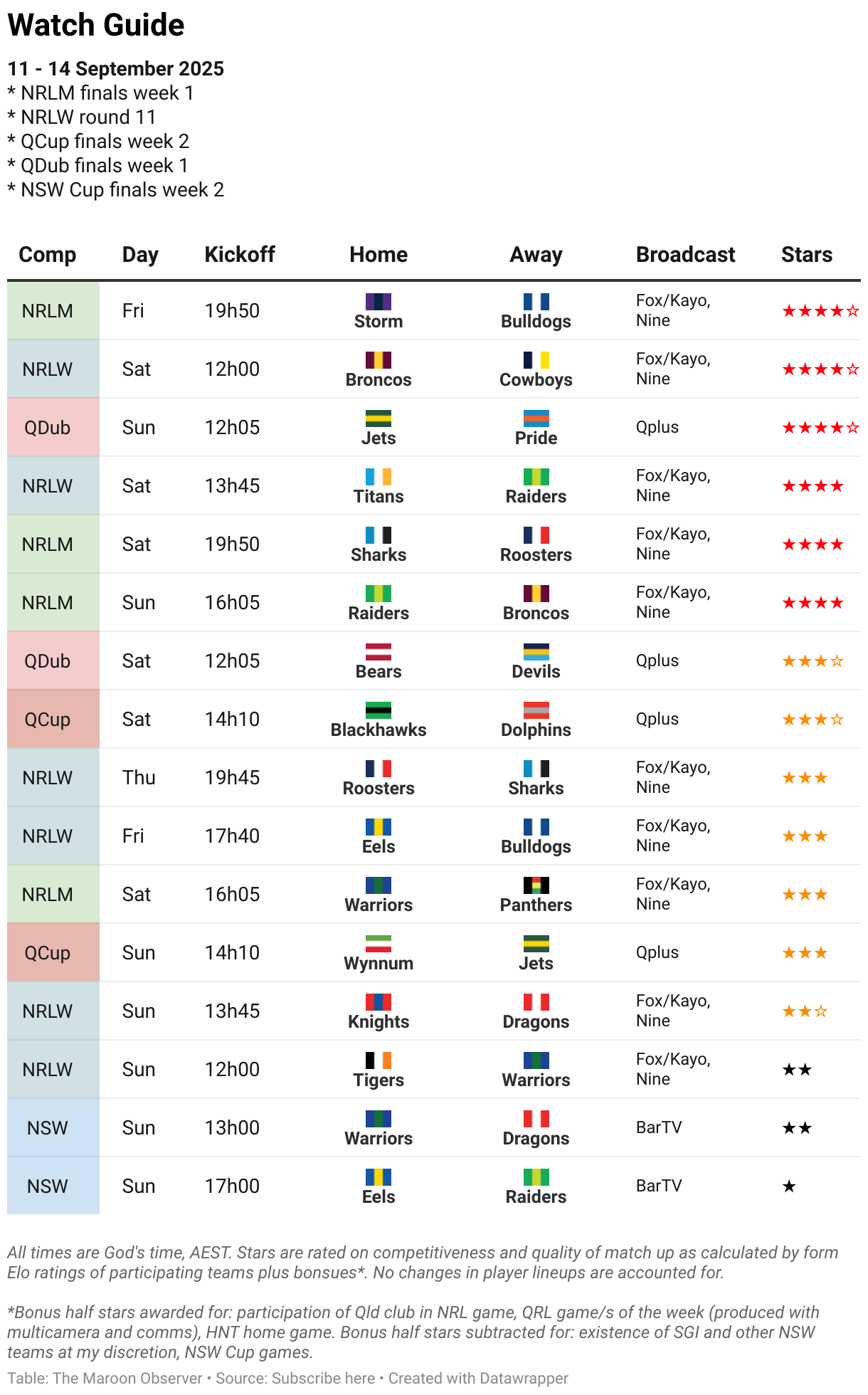 11 - 14 September 2025 * NRLM finals week 1 * NRLW round 11 * QCup finals week 2 * QDub finals week 1 * NSW Cup finals week 2