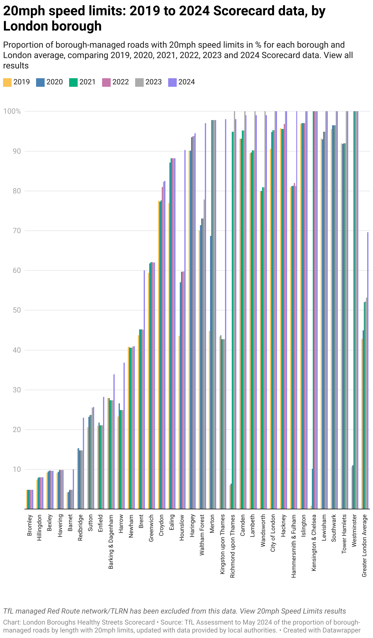 Proportion of borough-managed roads with 20mph speed limits in % for each borough and London average, comparing 2019, 2020, 2021, 2022, 2023 and 2024 Scorecard data. View all results
