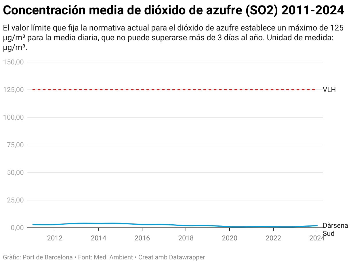 El valor límite que fija la normativa actual para el dióxido de azufre establece un máximo de 125 µg/m³ para la media diaria, que no puede superarse más de 3 días al año. Unidad de medida: µg/m³.