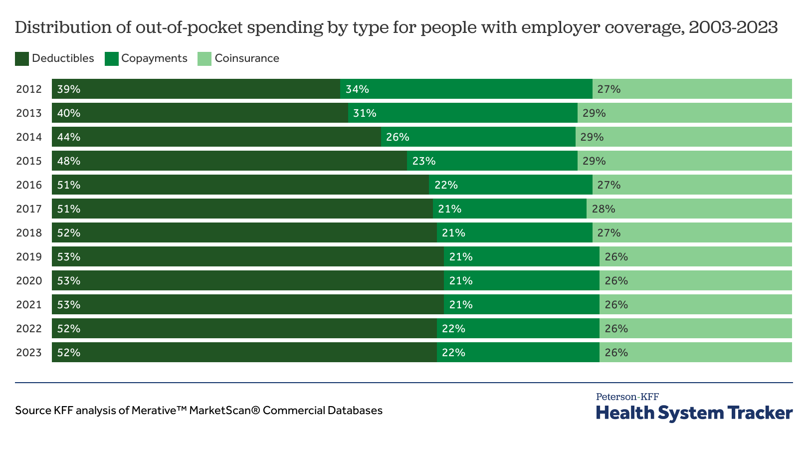 Distribution of out-of-pocket spending by type for people with employer coverage, 2003-2023