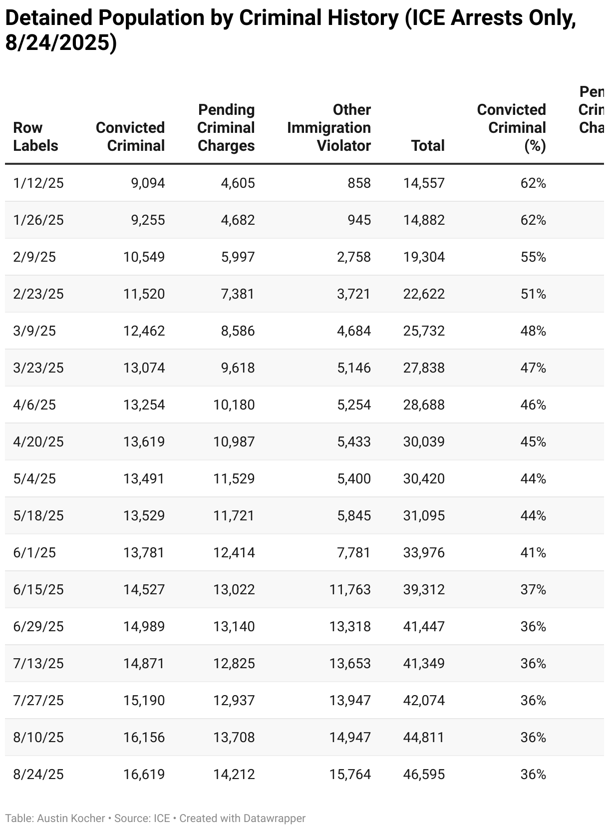 Detained Population by Criminal History (ICE Arrests Only, 8/24/2025)
