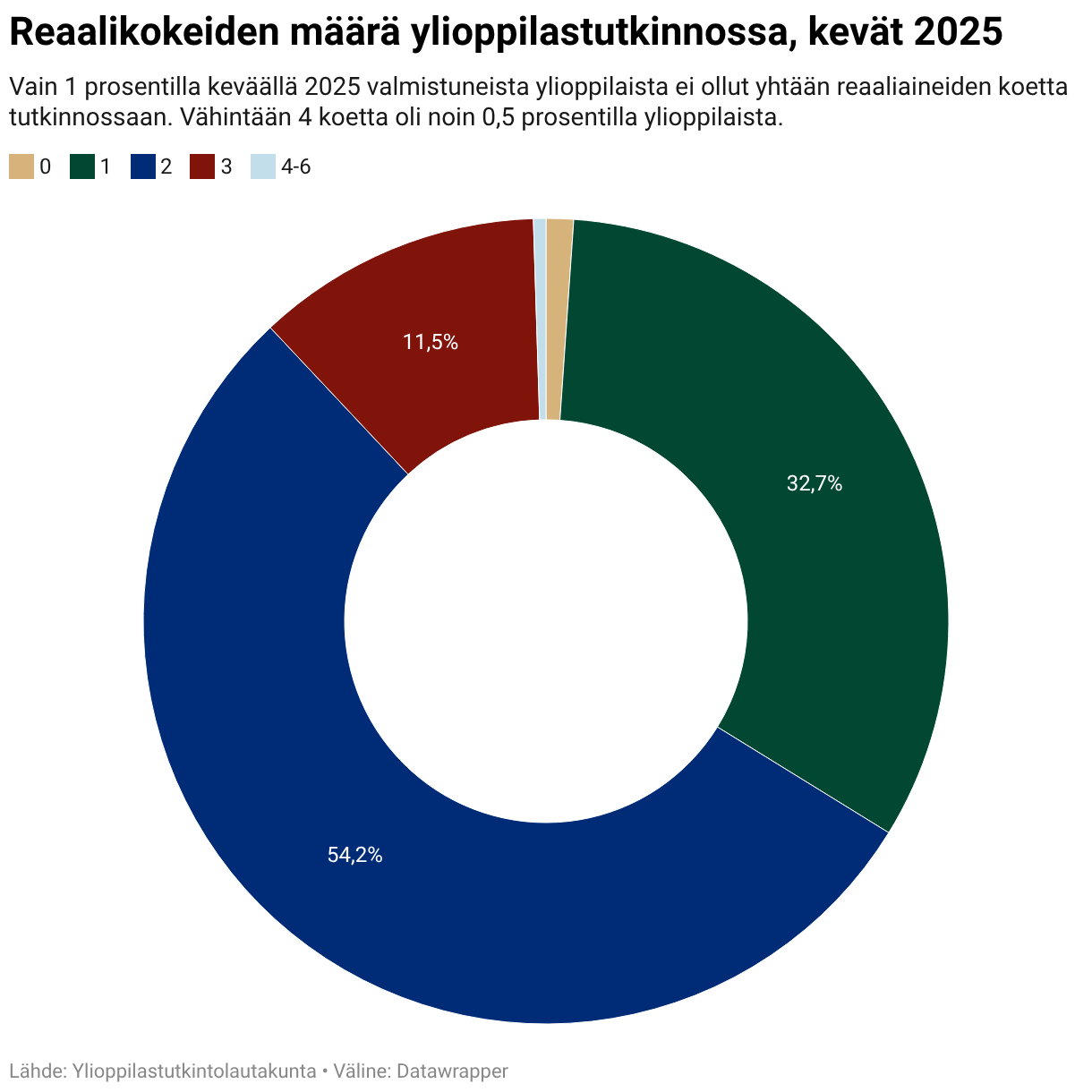 Vain 1 prosentilla keväällä 2025 valmistuneista ylioppilaista ei ollut yhtään reaaliaineiden koetta tutkinnossaan. Vähintään 4 koetta oli noin 0,5 prosentilla ylioppilaista.