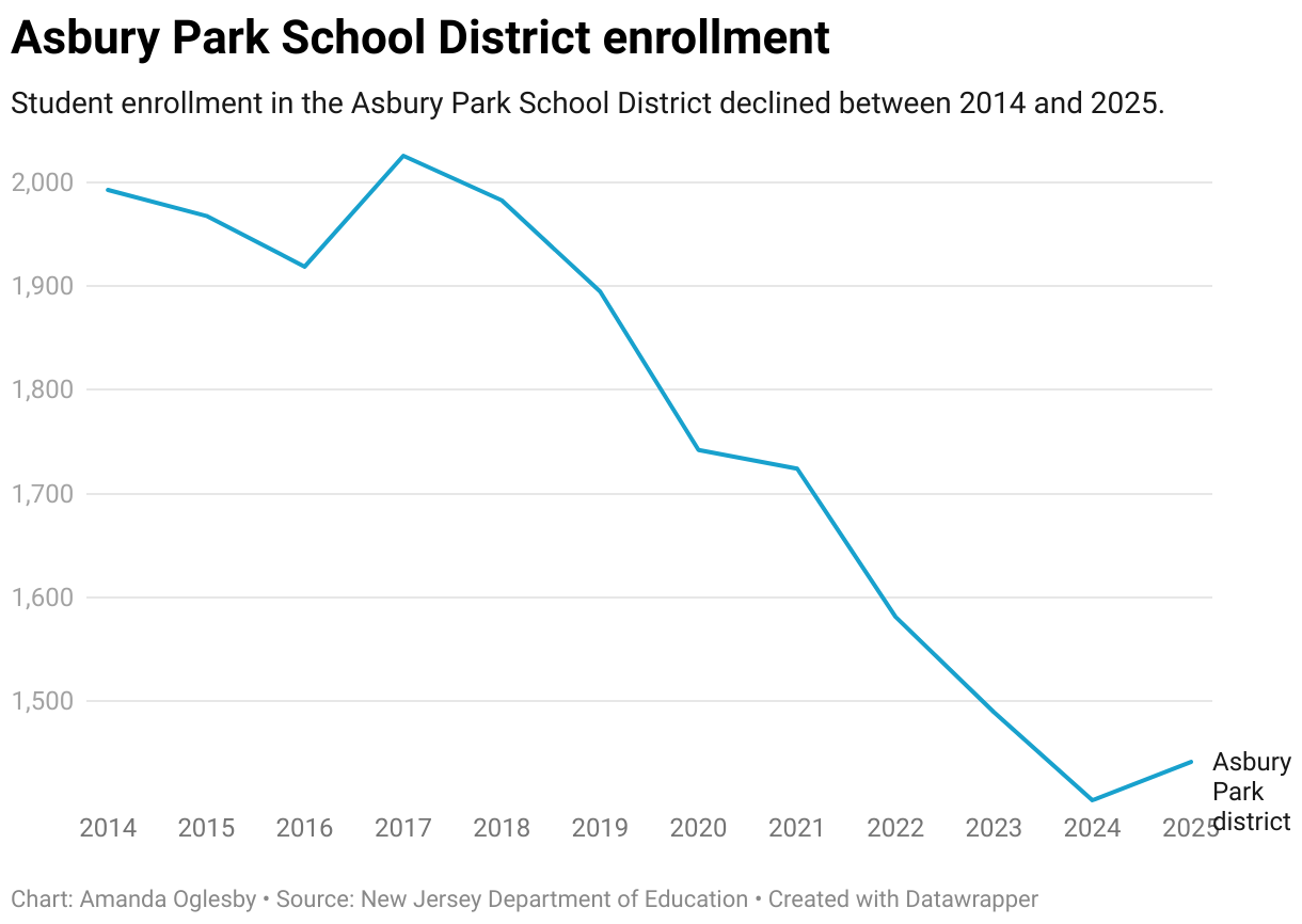 Student enrollment in the Asbury Park School District declined between 2014 and 2025.