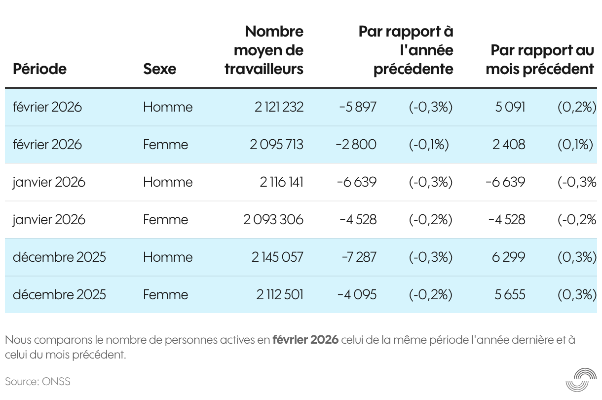 Nous comparons le nombre de personnes actives en février 2026 celui de la même période l'année dernière et à celui du mois précédent.