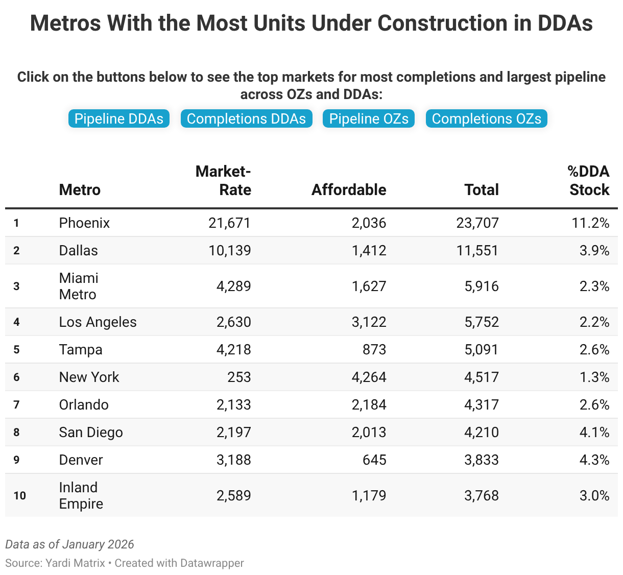 Click on the buttons below to see the top markets for most completions and largest pipeline across OZs and DDAs: