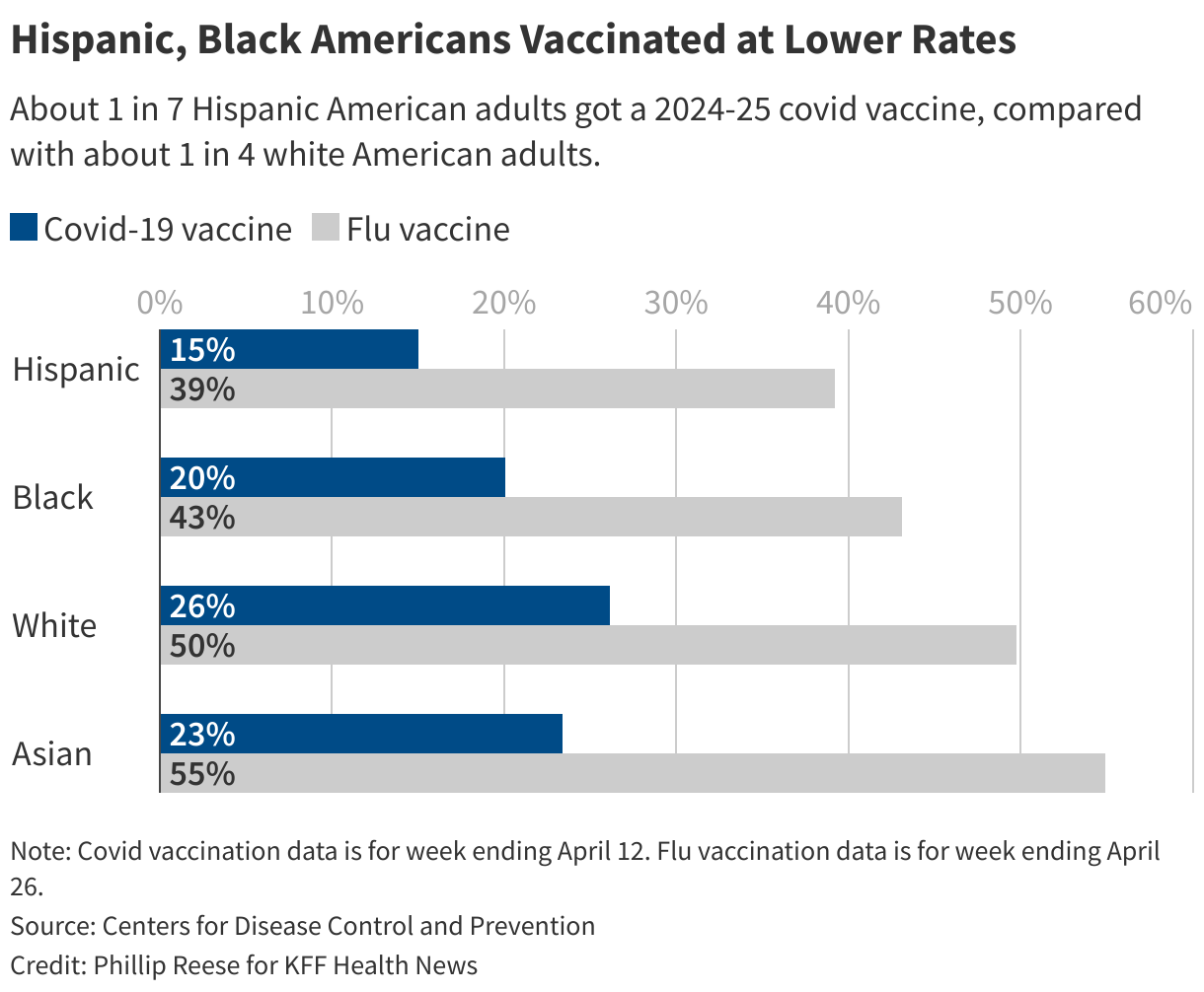About 1 in 7 Hispanic American adults got a 2024-25 covid vaccine, compared with about 1 in 4 white American adults.