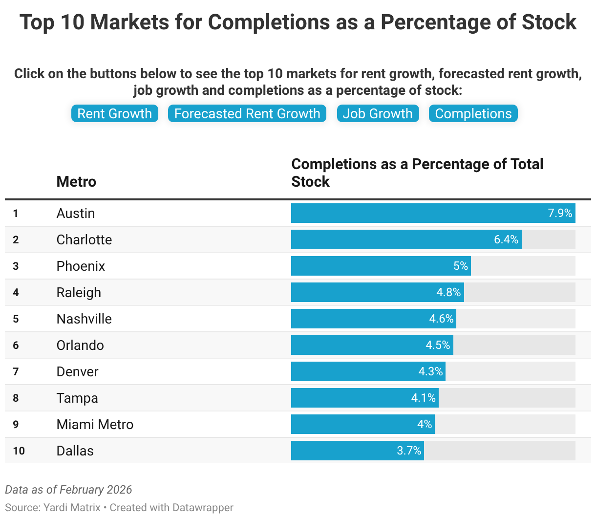 Click on the buttons below to see the top 10 markets for rent growth, forecasted rent growth, job growth and completions as a percentage of stock: