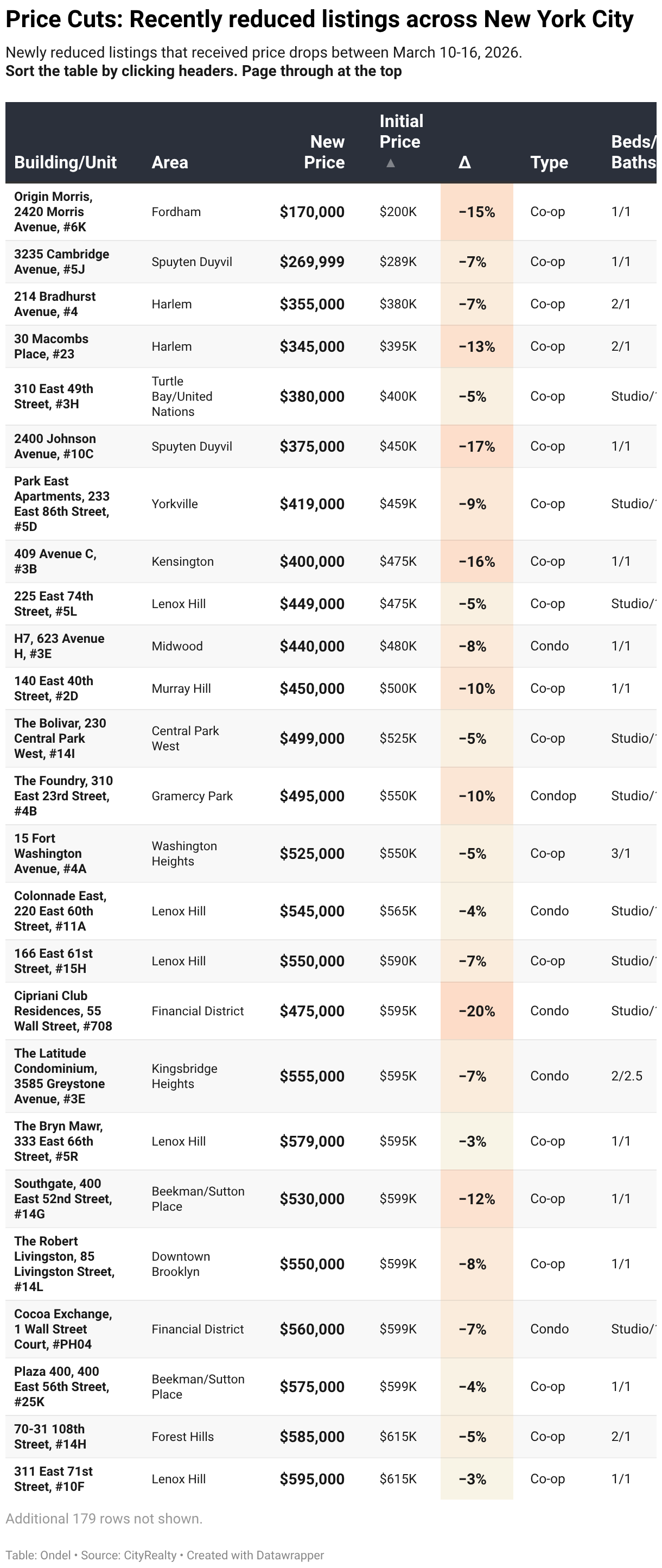 Newly reduced listings that received price drops between March 10-16, 2026. Sort the table by clicking headers. Page through at the top