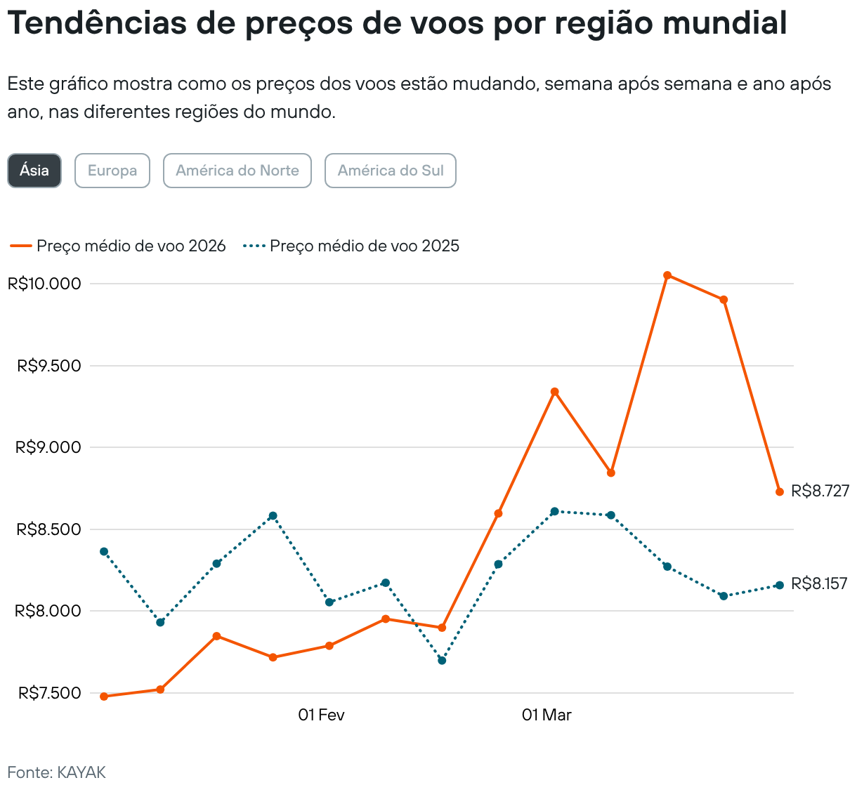 Tendências de preços de voos por região mundial Este gráfico mostra como os preços dos voos estão mudando, semana após semana e ano após ano, nas diferentes regiões do mundo. Ásia Europa América do Norte América do Sul