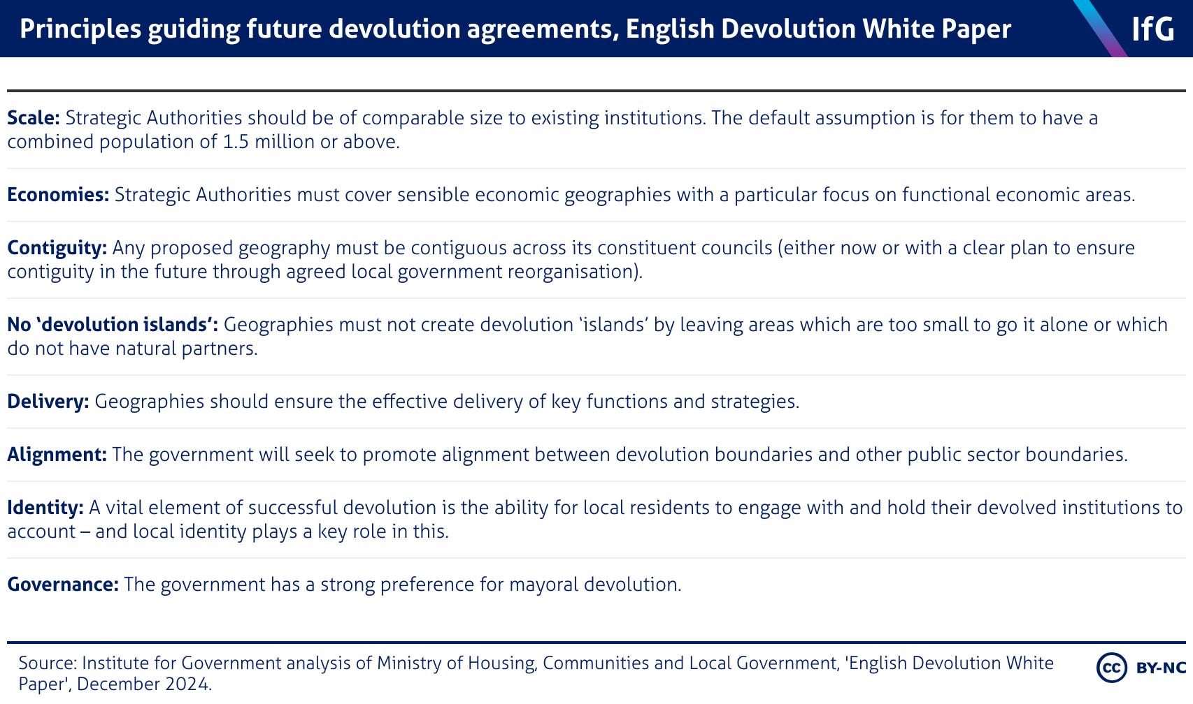 A list of eight geography and governance principles guiding future devolution agreements, as outlined in the English Devolution White Paper published by the government in December 2024.