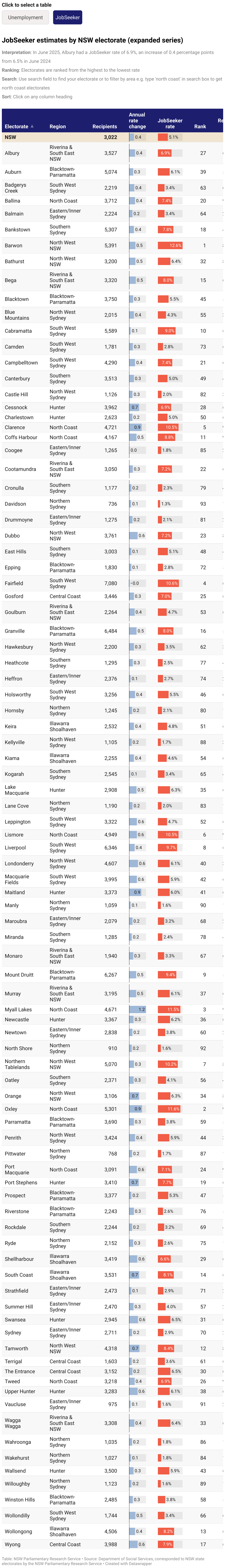 JobSeeker estimates by NSW electorate (expanded series)