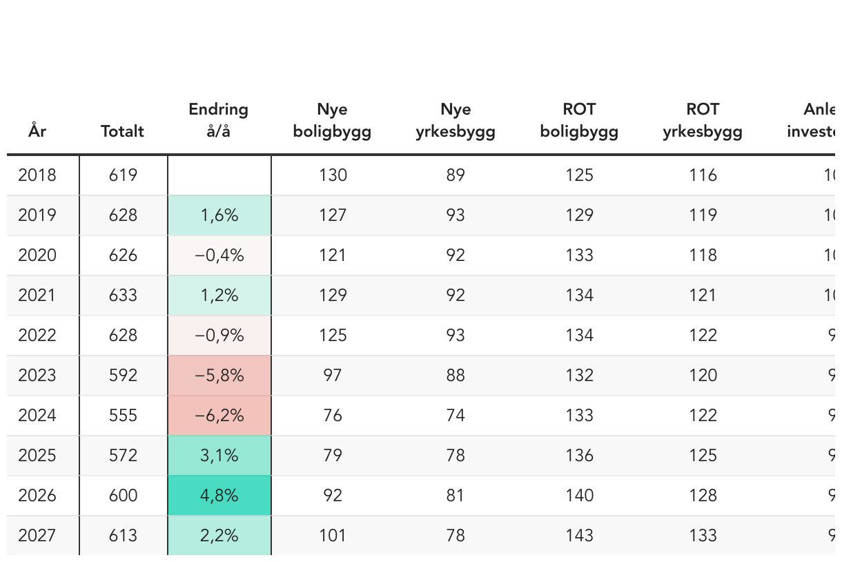 Produksjonsverdi av bygge- og anleggsarbeider i alt etter segment. Mrd. 2025-NOK.
