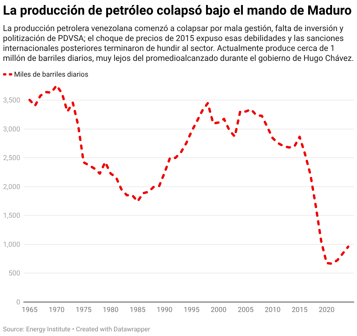 La producción petrolera venezolana comenzó a colapsar por mala gestión, falta de inversión y politización de PDVSA; el choque de precios de 2015 expuso esas debilidades y las sanciones internacionales posteriores terminaron de hundir al sector. Actualmente produce cerca de 1 millón de barriles diarios, muy lejos del promedioalcanzado durante el gobierno de Hugo Chávez.