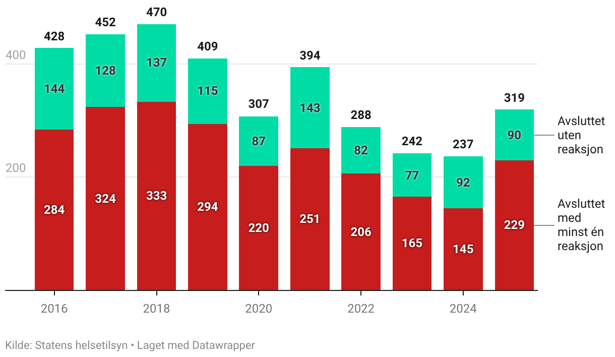 År Avsluttet med minst én reaksjon Avsluttet uten reaksjon 2016 284 144 2017 324 128 2018 333 137 2019 294 115 2020 220 87 2021 251 143 2022 206 82 2023 165 77 2024 145 92 2025 229 90